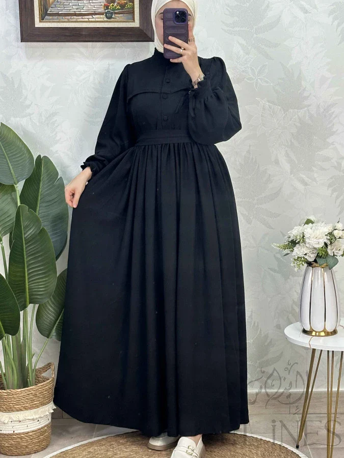 فستان محتشم باللون الأسود الكلاسيكي، قصّة واسعة وأنيقة كتجمع بين الوقار والرّاحة. مزوّد بكُمّات منفّخة و ياقة عالية كتزيد من فخامته. اللون الأسود كيعطيه طابع راقي ومناسب لأي مناسبة أو خروج يومي.